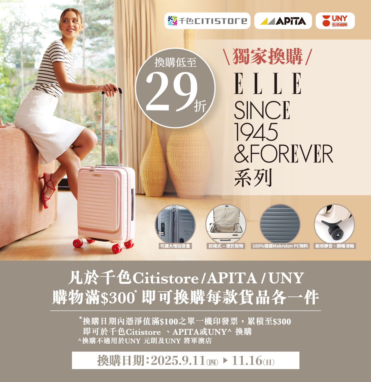 - 由2025年9月11日至11月16日,顧客凡於千色Citistore、APITA或UNY購物淨值滿$300 (或以淨值滿$100之單一機印發票累積至$300),憑有效機印發票到千色Citistore、APITA或UNY樂富店任何一間之禮品換購處,即可憑優惠價換購「ELLE Since 1945 & Forever系列」之貨品(每次最多可換購每款各一件),CU APP會員更可專享指定會員換購價。