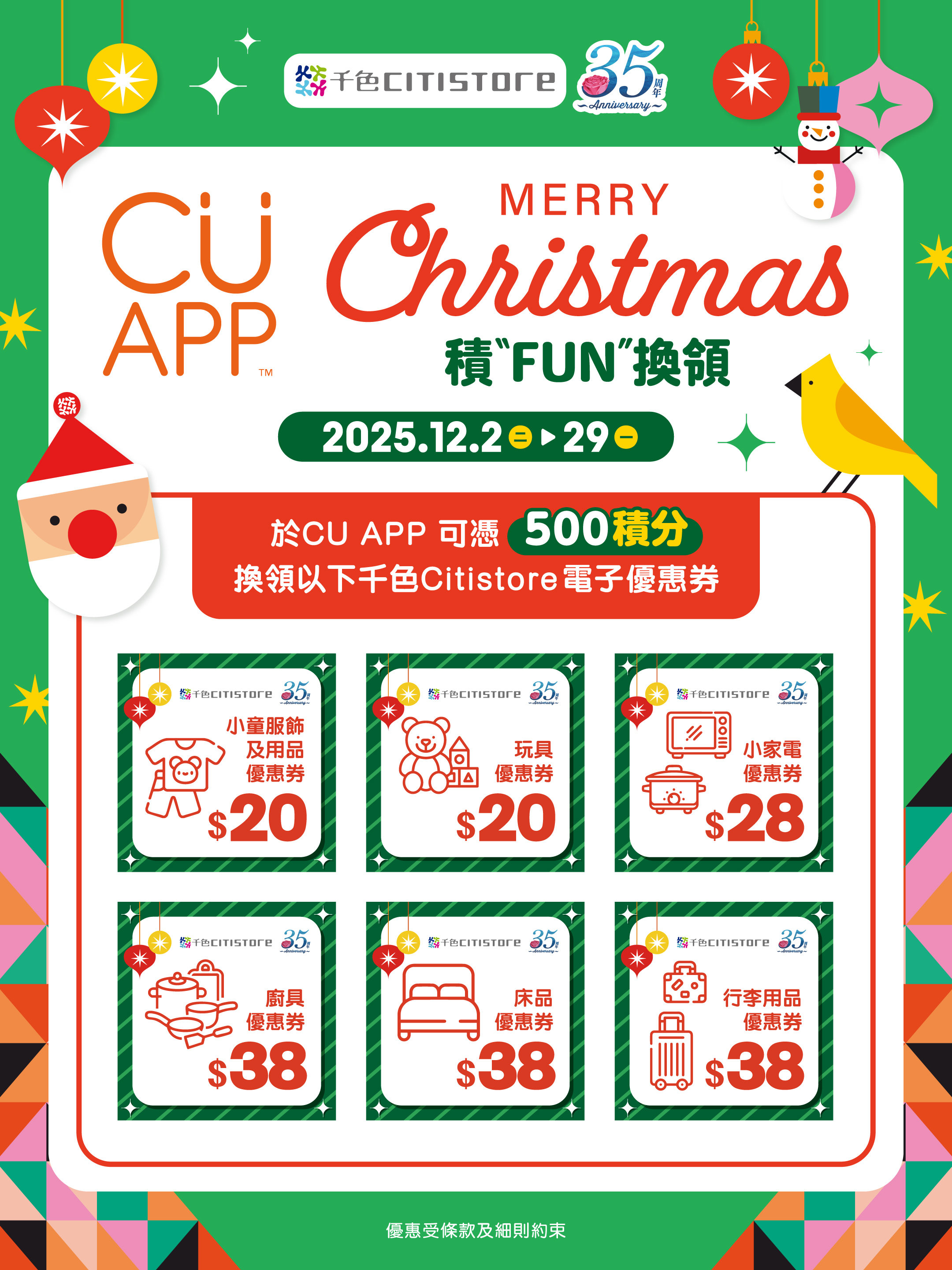 • CU APP 會員憑指定積分可換領各款千色Citistore 電子優惠券,需購物滿指定金額方可使用。