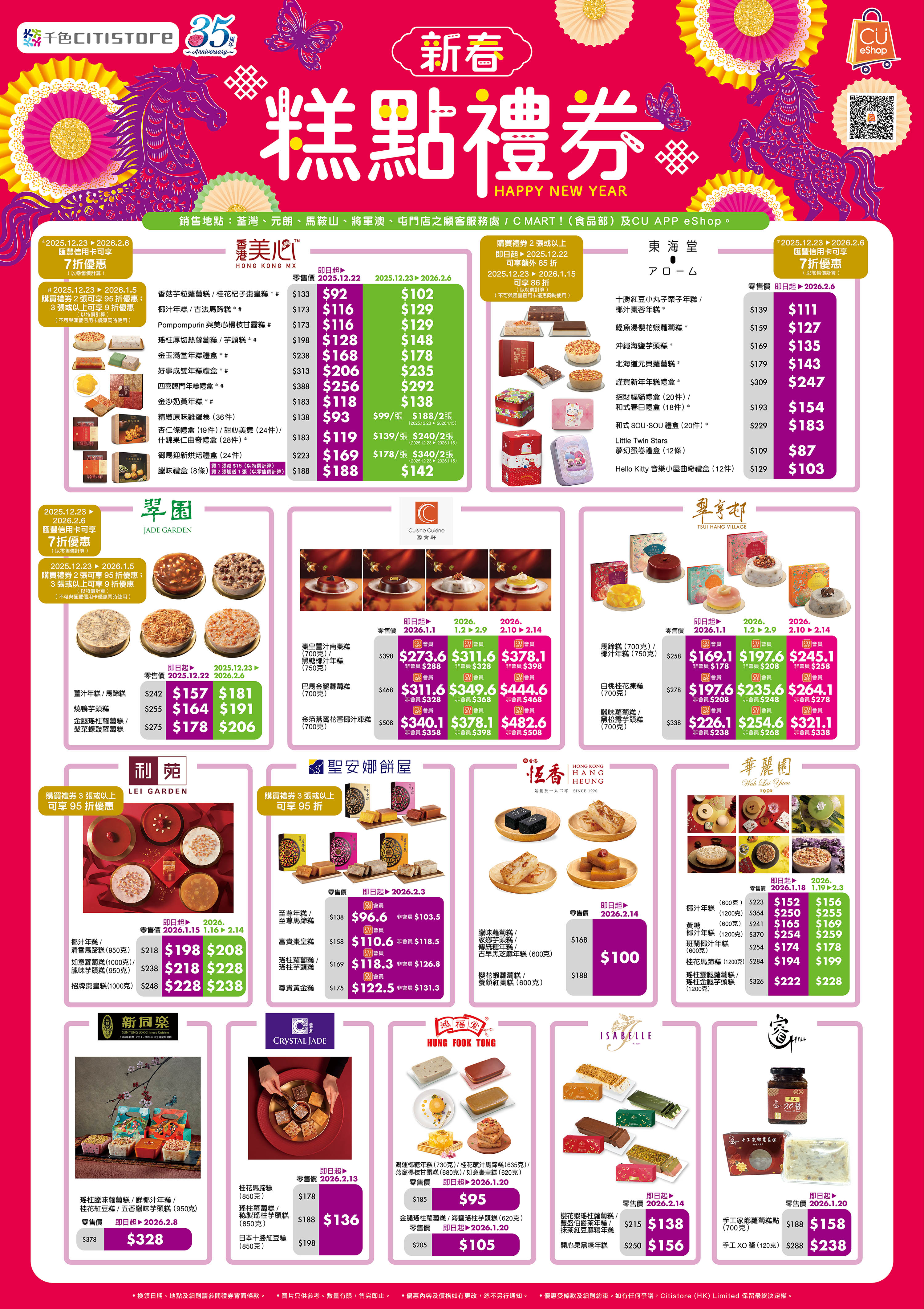 即日起,千色Citistore為大家預備多個早鳥賀年糕點禮券,包括美心、國金軒、利苑、聖安娜餅屋及銀杏館等,讓您與親友樂享賀年滋味,更可盡享多項早鳥優惠!