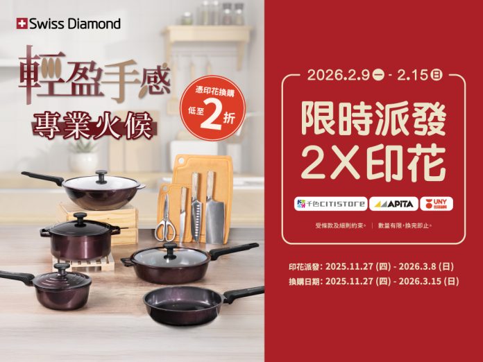 - 是次活動使用的產品均為Swiss Diamond製造並授權在APITA、千色Citistore及UNY的店舖換購。產品以實物為準,換購產品須受有關條款及細則約束,優惠詳情請向店內職員查詢或參閱店內宣傳品。