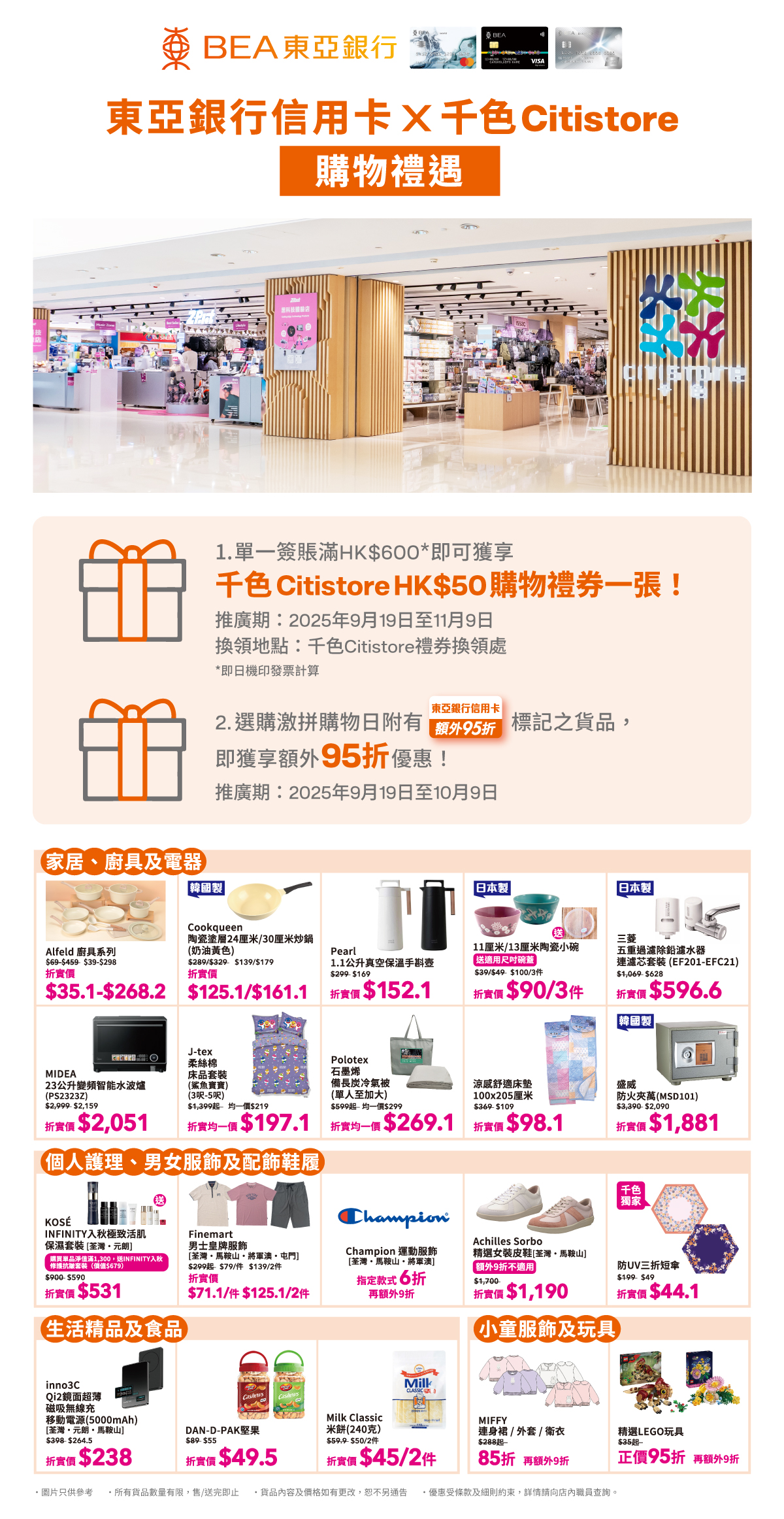 優惠2:於千色Citistore激拼購物日選購指定貨品享額外95折(2025年9月19日至2025年10月9日) - 已取消、退款、偽造或未誌賬的交易及銀行不時指定的交易。不合資格交易包括: