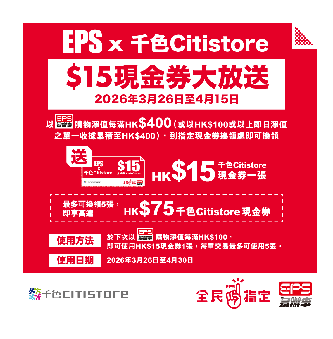 由2026年3月26日至4月30日,於千色Citistore以EPS購物淨值每滿港幣$400 (或以$100即日淨值之單一機印發票累積至$400),憑有效之即日機印發票及相關EPS收據到指定現金券換領處即可換領千色Citistore HK$15現金券1張;購物滿淨值HK$800,即可換領HK$15現金券2張,如此類推,每人每次最多可以換領HK$15現金券5張。