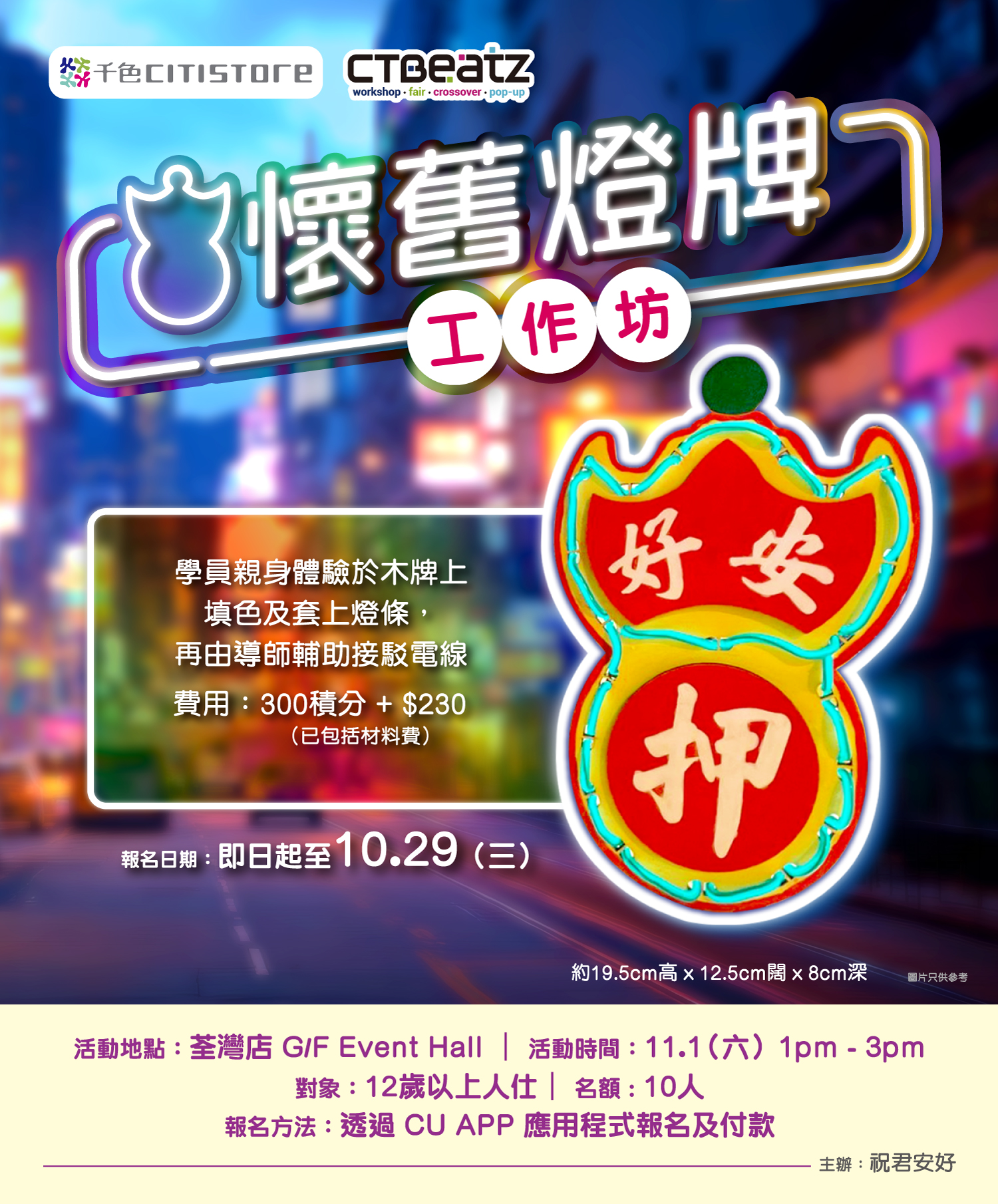 - 如參加人數不足或特妹情況下,千色 Citistore 將保留更改或取消工作坊的權利。